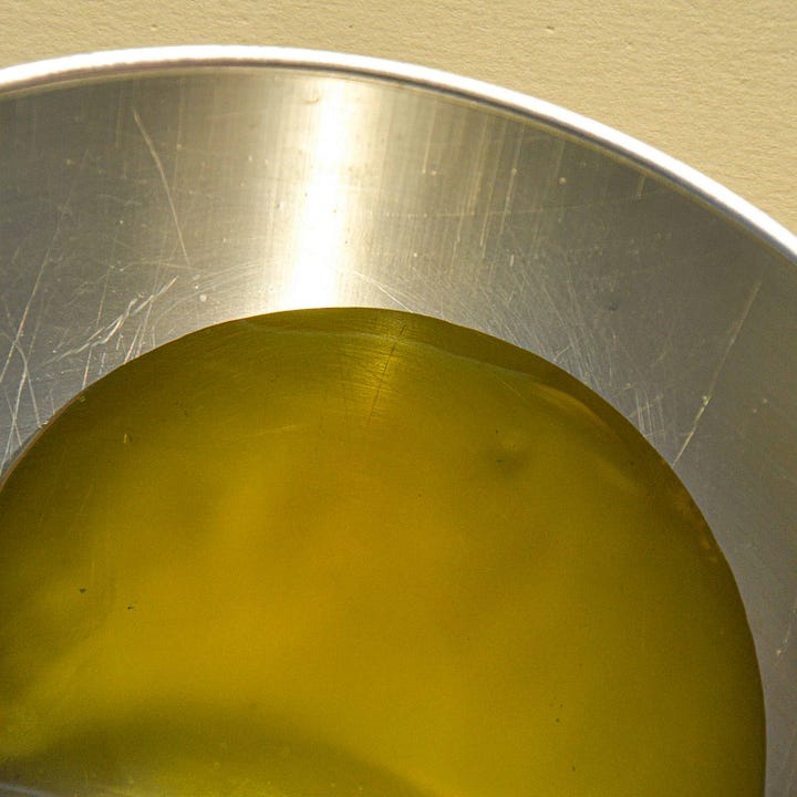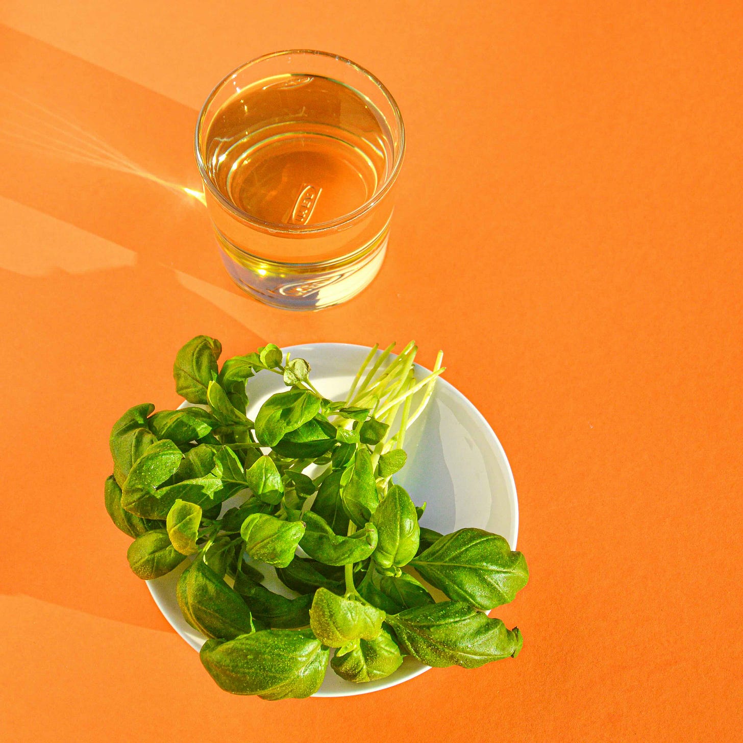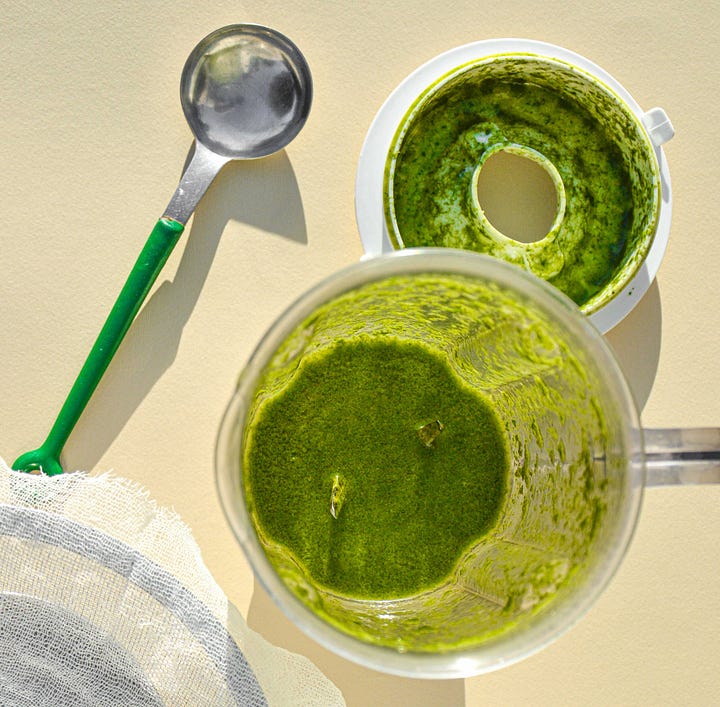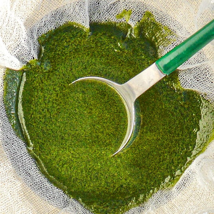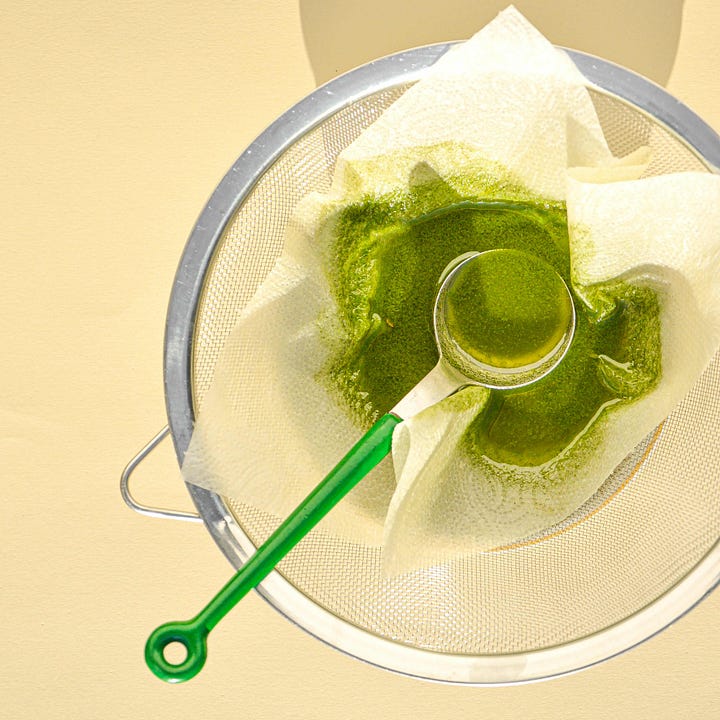 Once the oil is prepared (see photo below), place a fine sieve lined with kitchen paper over a bowl. Pour the blended basil oil through the sieve and let it drip into the bowl, allowing the solids to separate from the liquid.