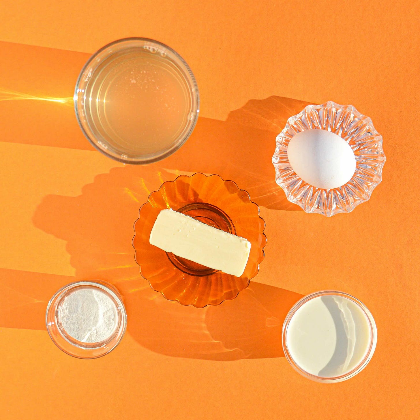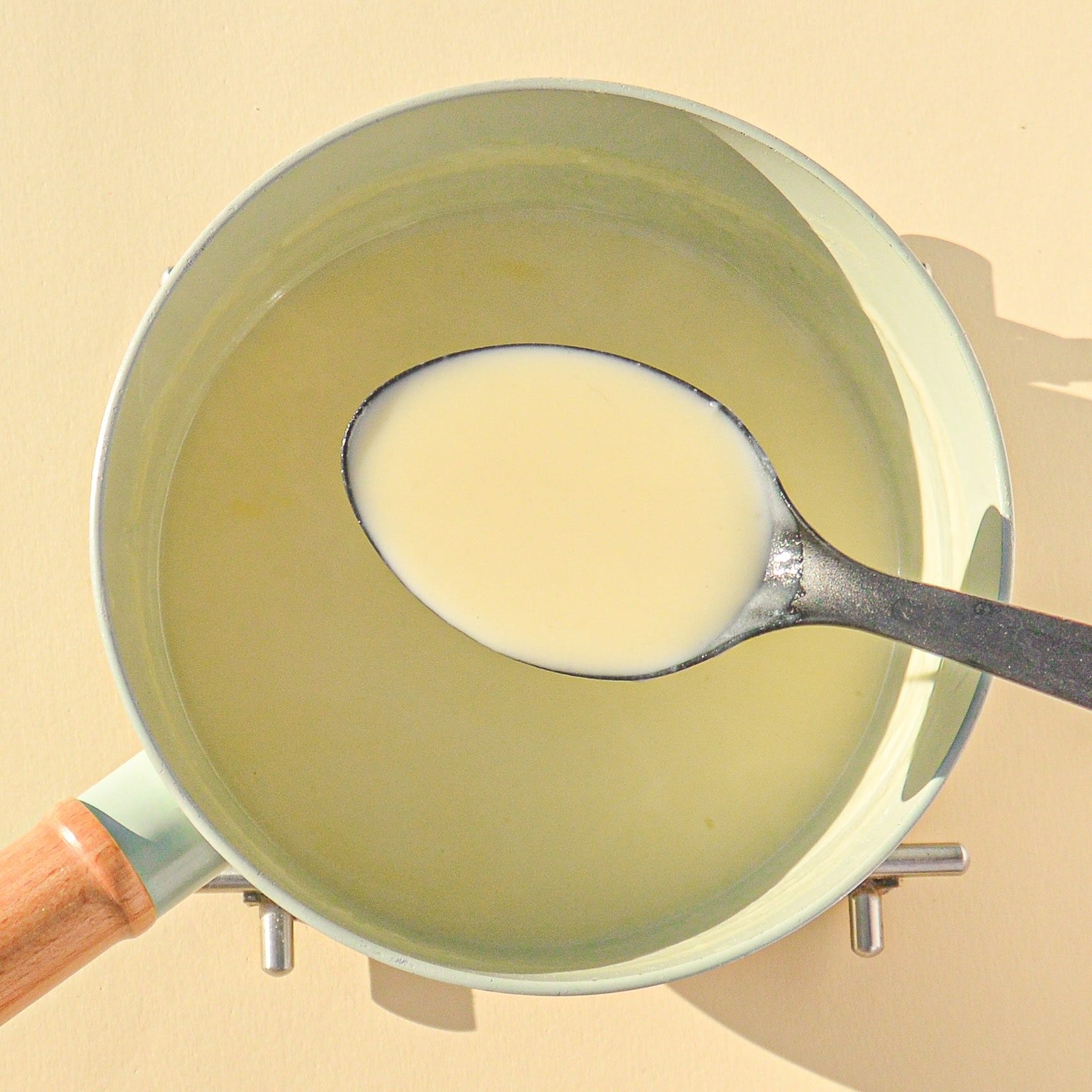 Next, make the blond roux: in a pot, melt 25 g of unsalted butter over low heat. Once melted, stir in 25 g of sieved plain flour and cook, stirring constantly, until the mixture changes from white to a pale yellow - about 4 minutes.