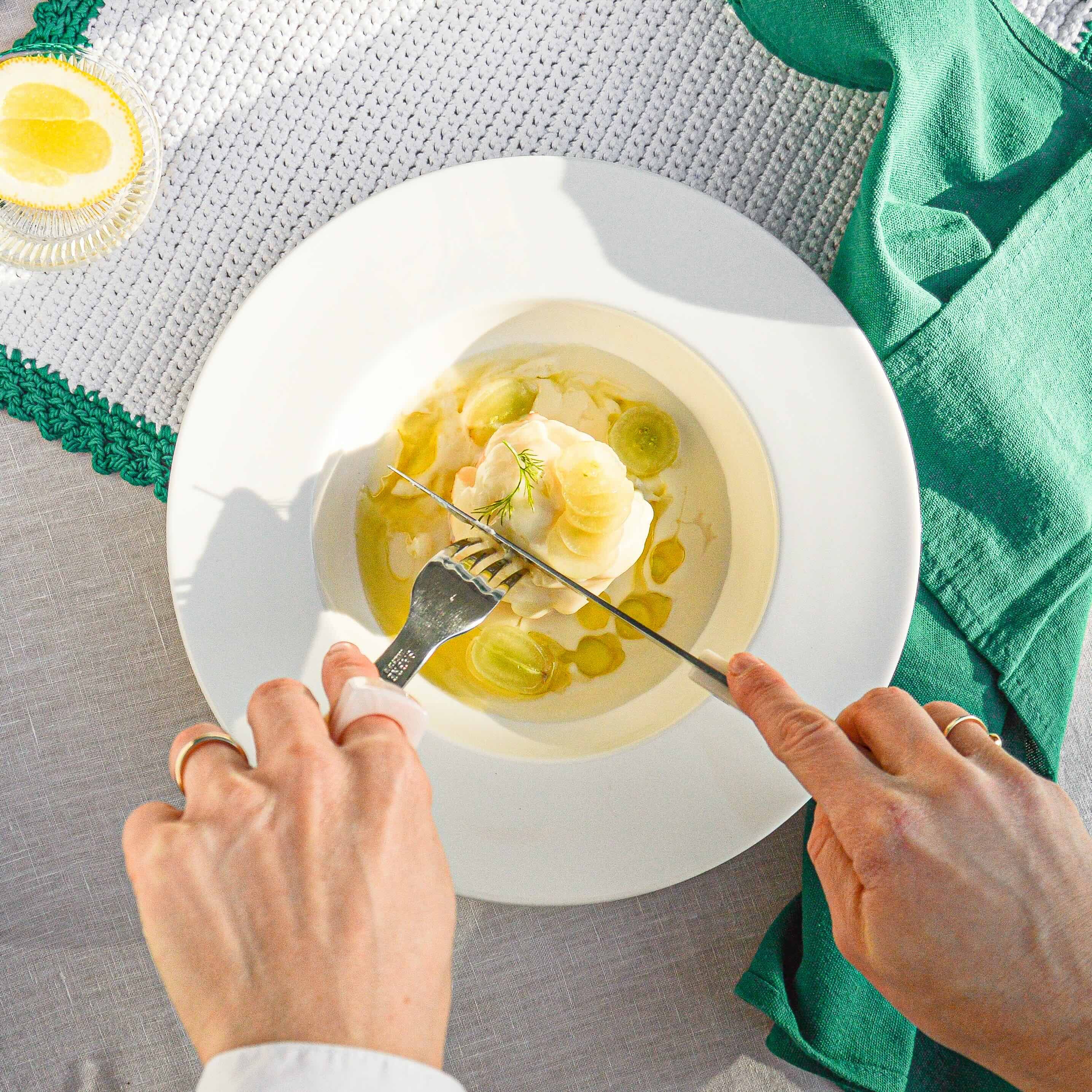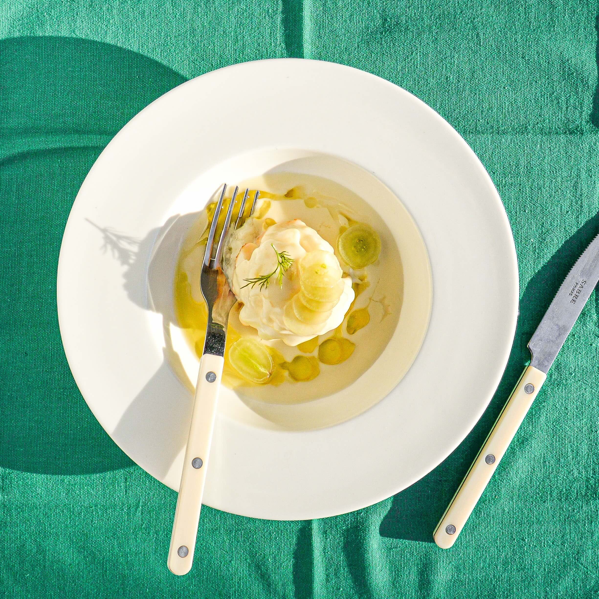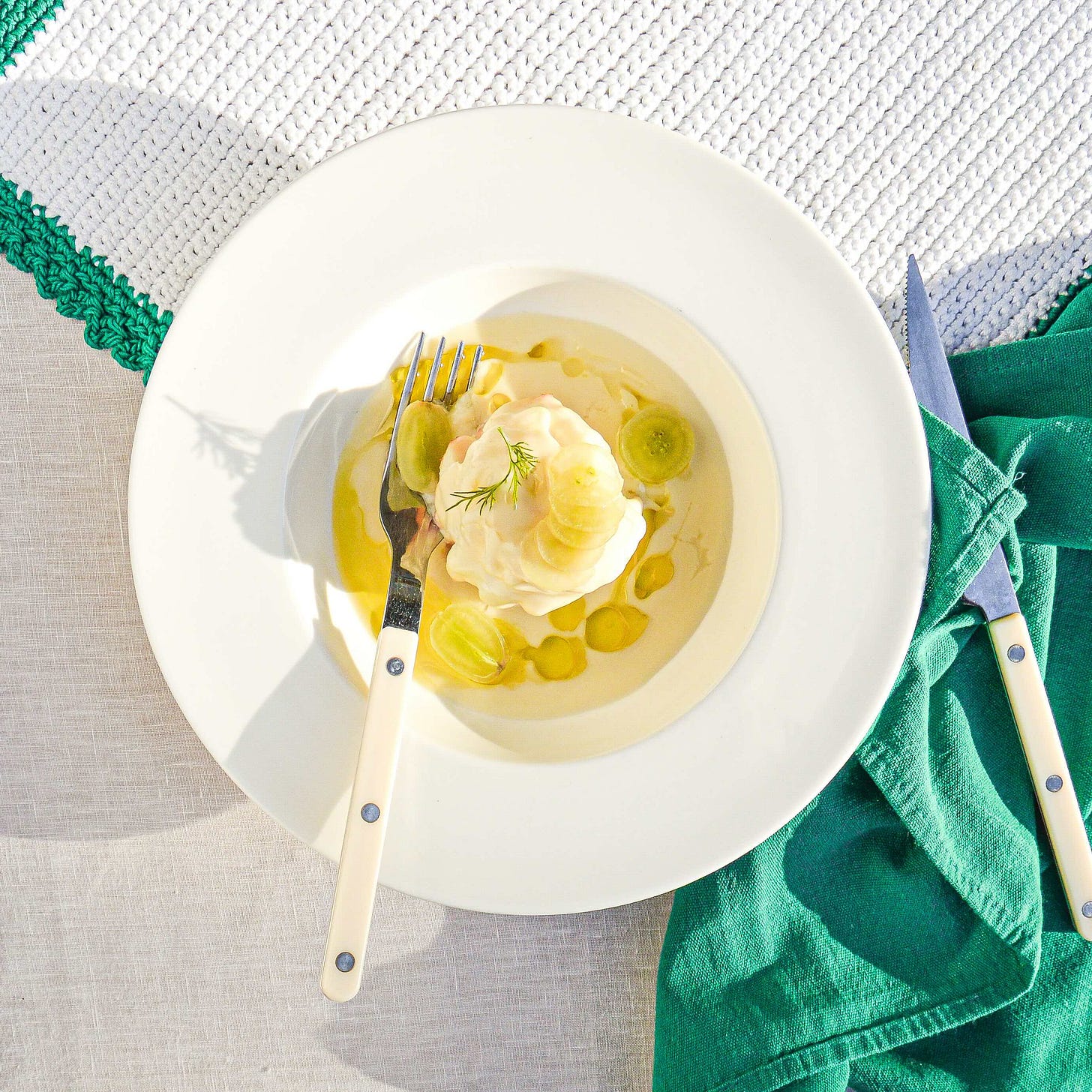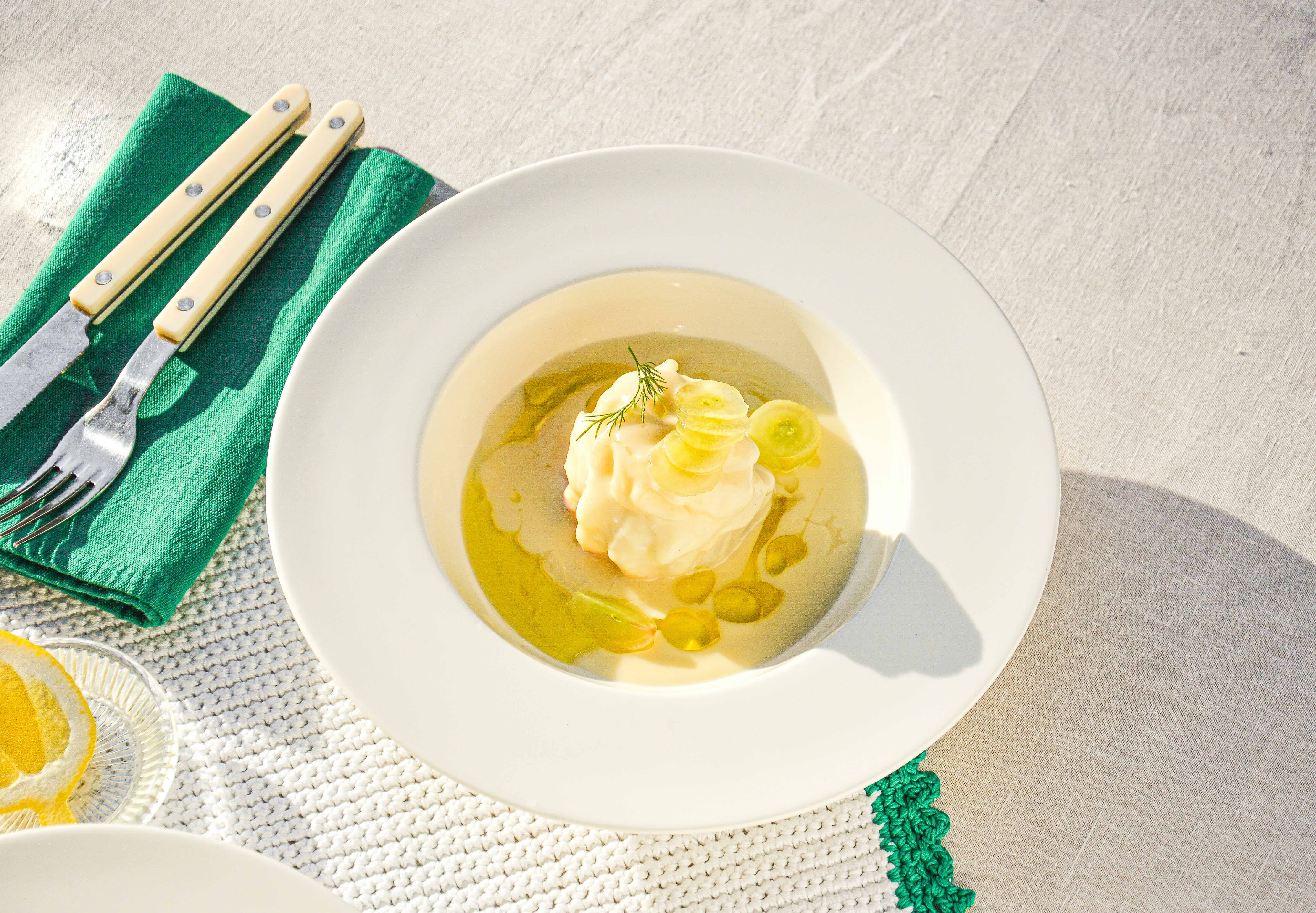 In a serving bowl, add the warm fish velouté and the cooked rolled cod. Garnish with drops of basil oil, the halved and sliced grapes, and a frond of dill.
