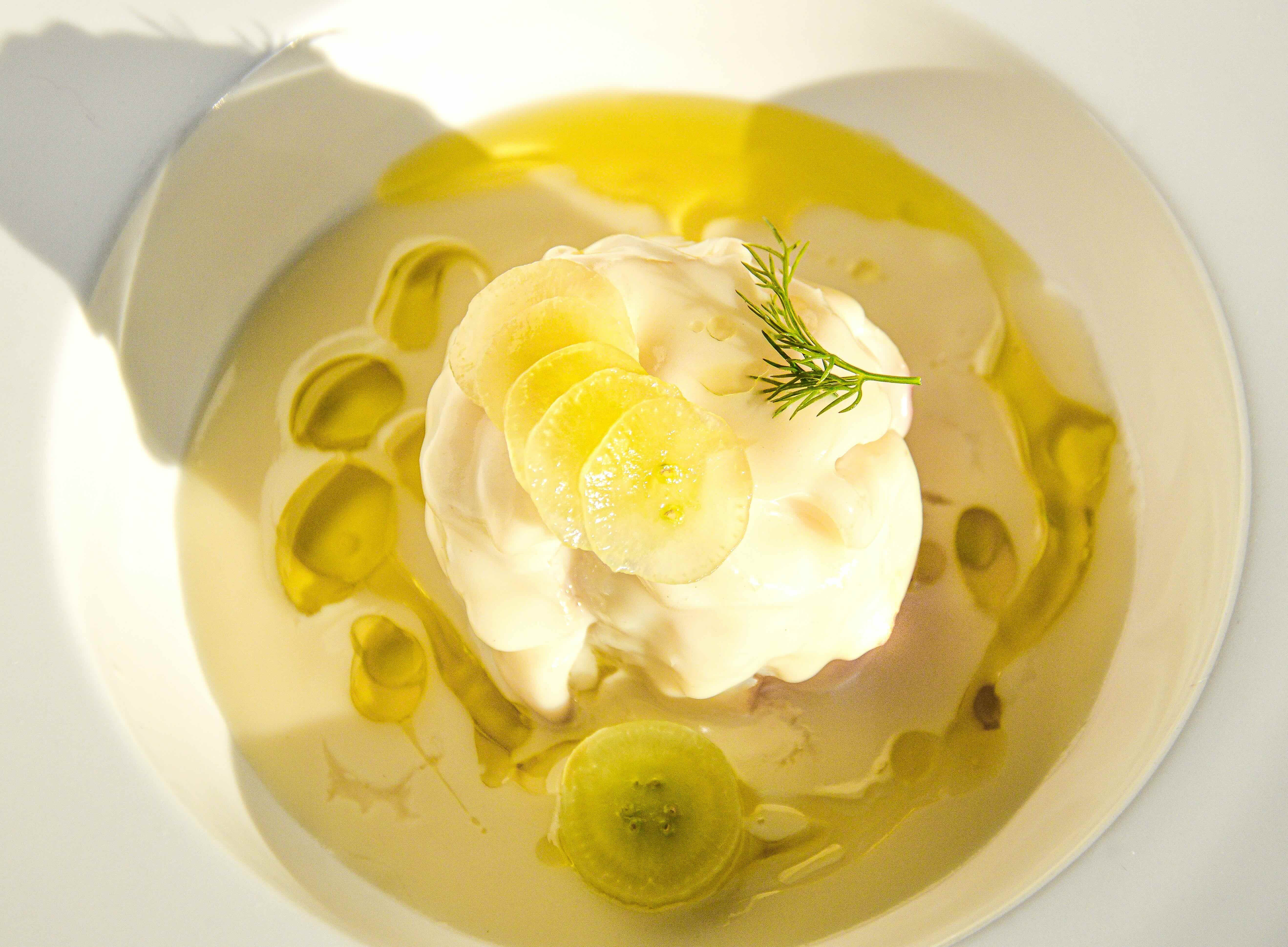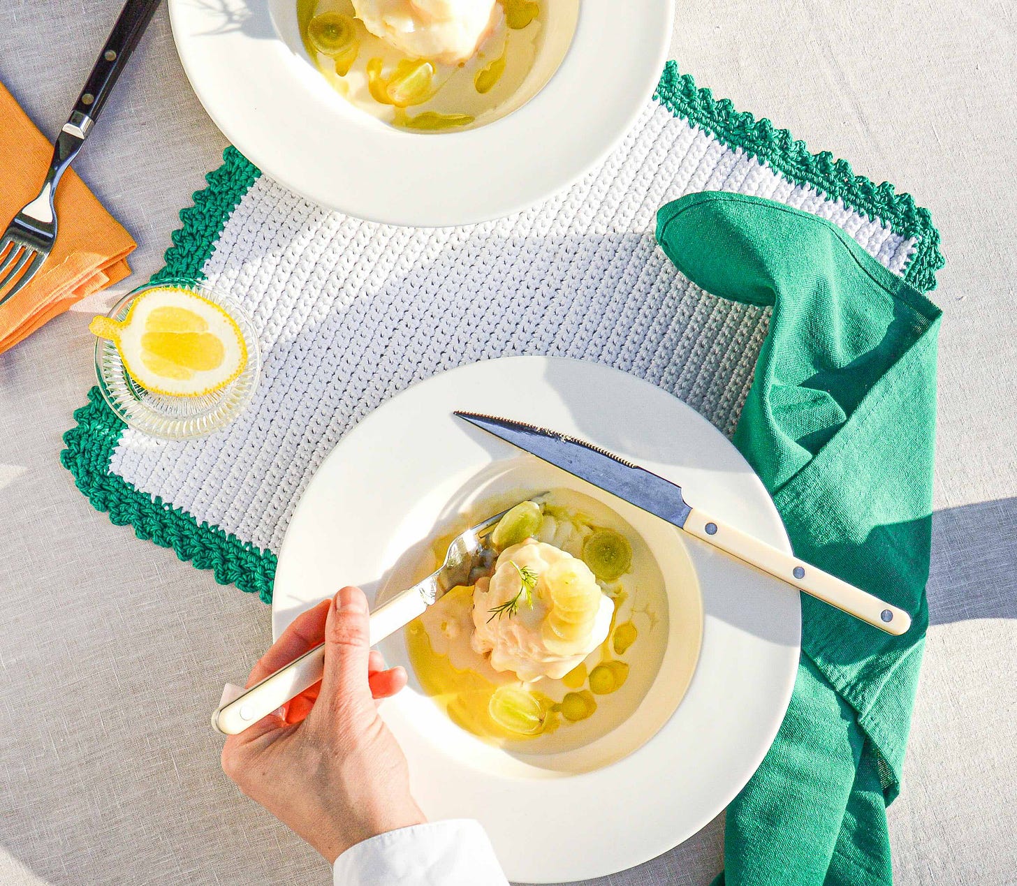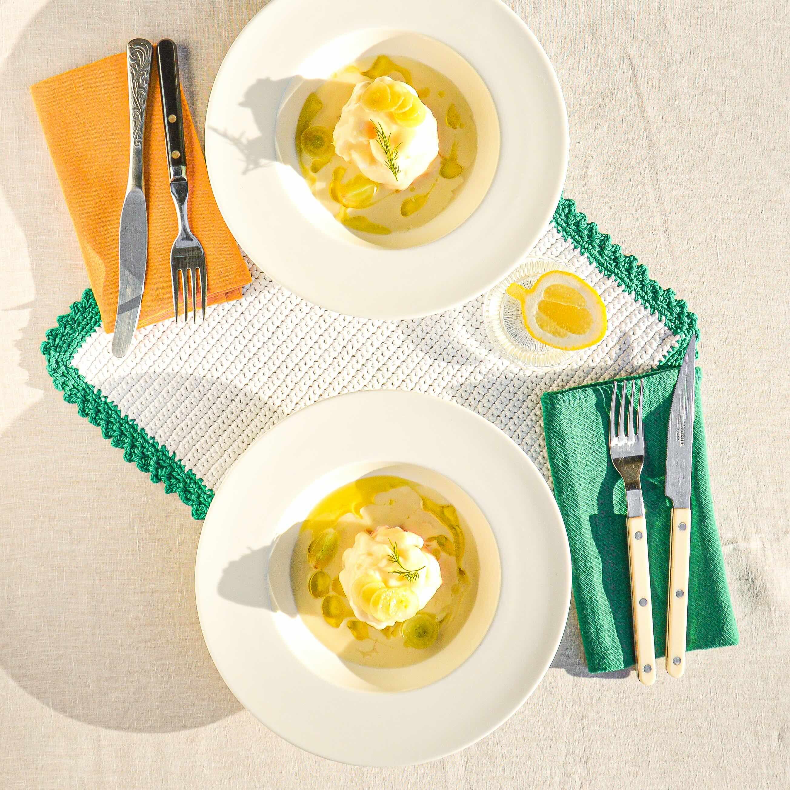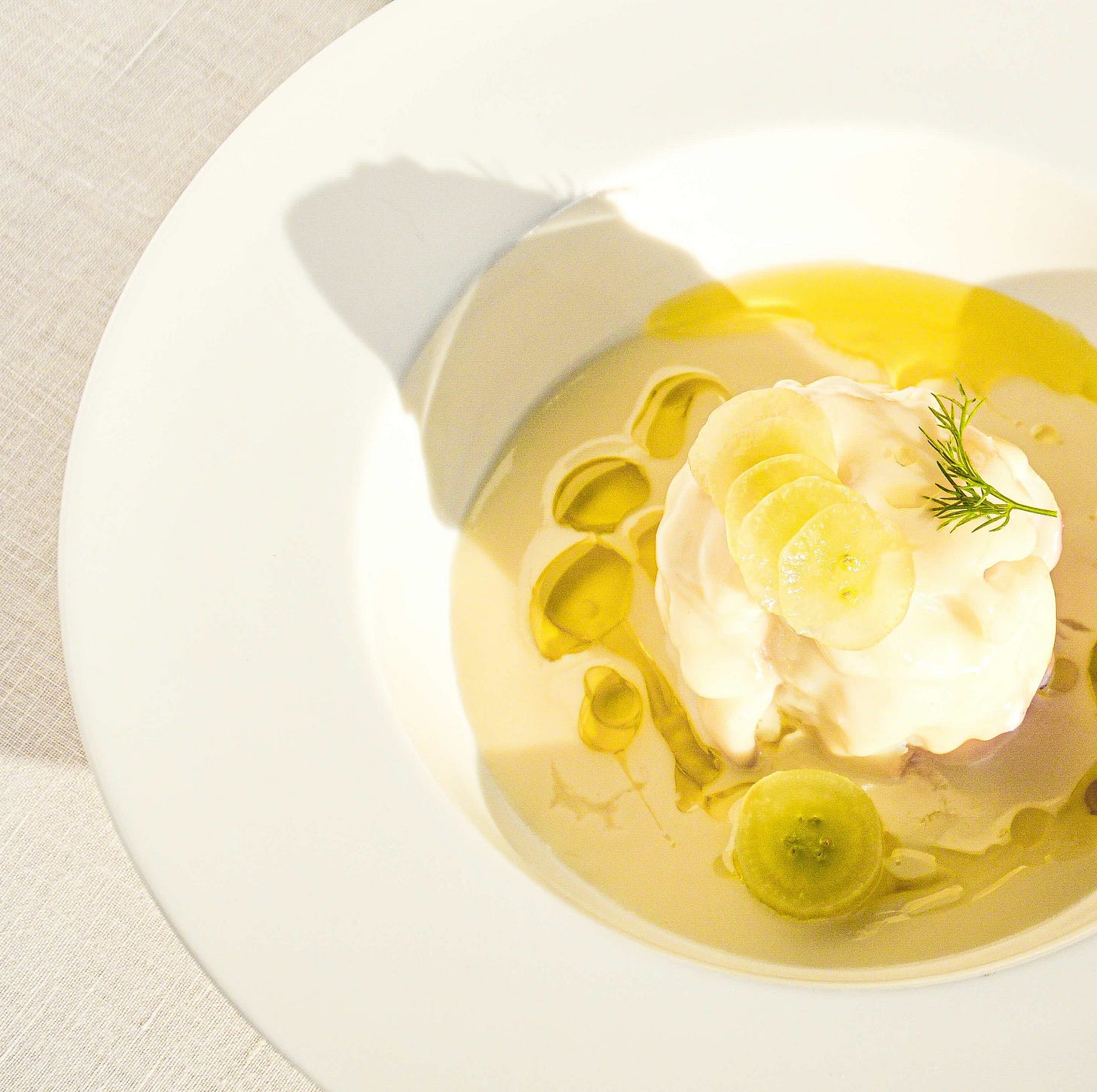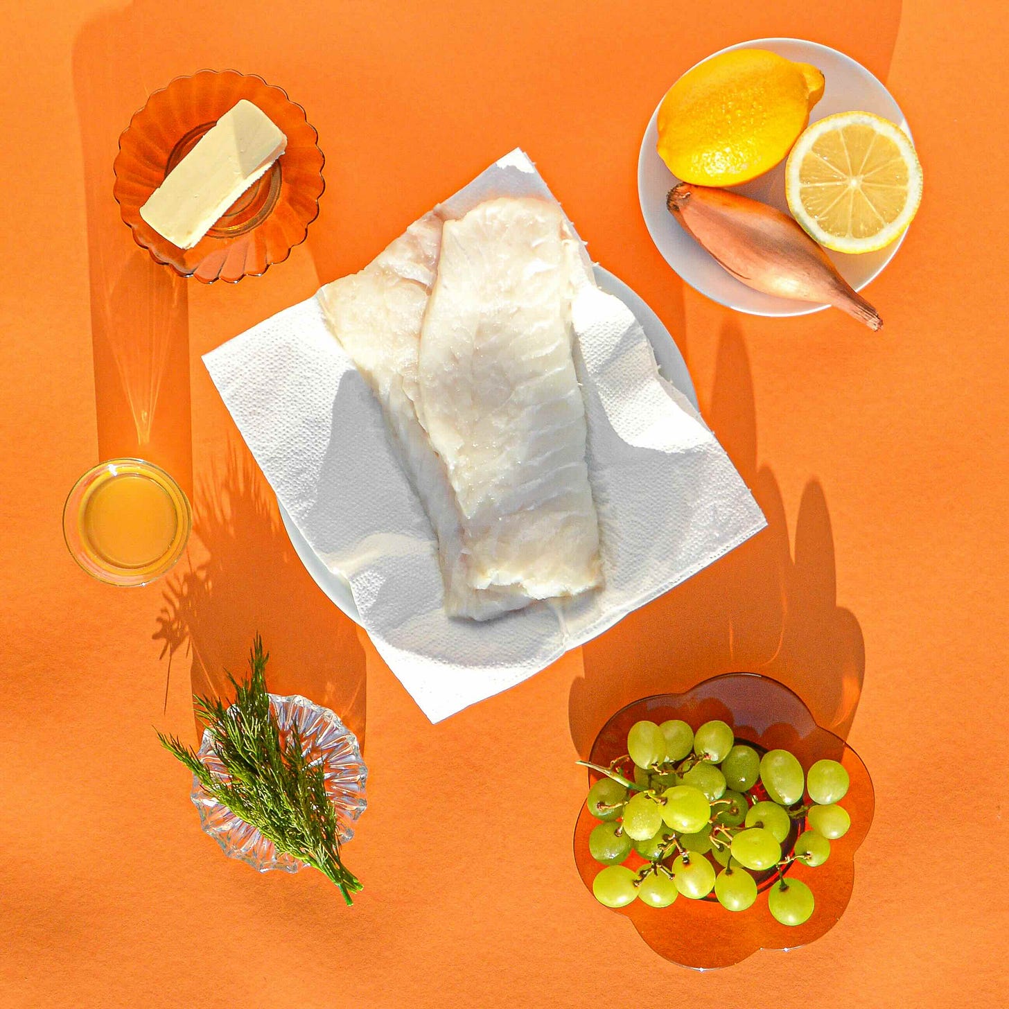 In a serving bowl, add the warm fish velouté and the cooked rolled cod. Garnish with drops of basil oil, the halved and sliced grapes, and a frond of dill.