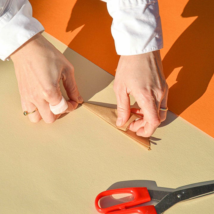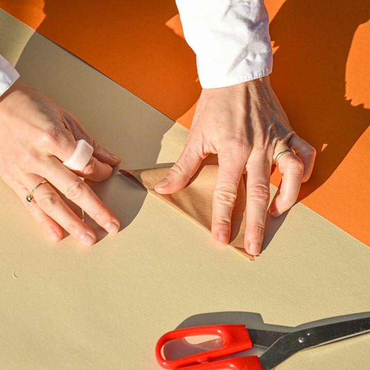 Fold it in half to form a triangle as shown in the first photo, then fold the triangle 3 more times.