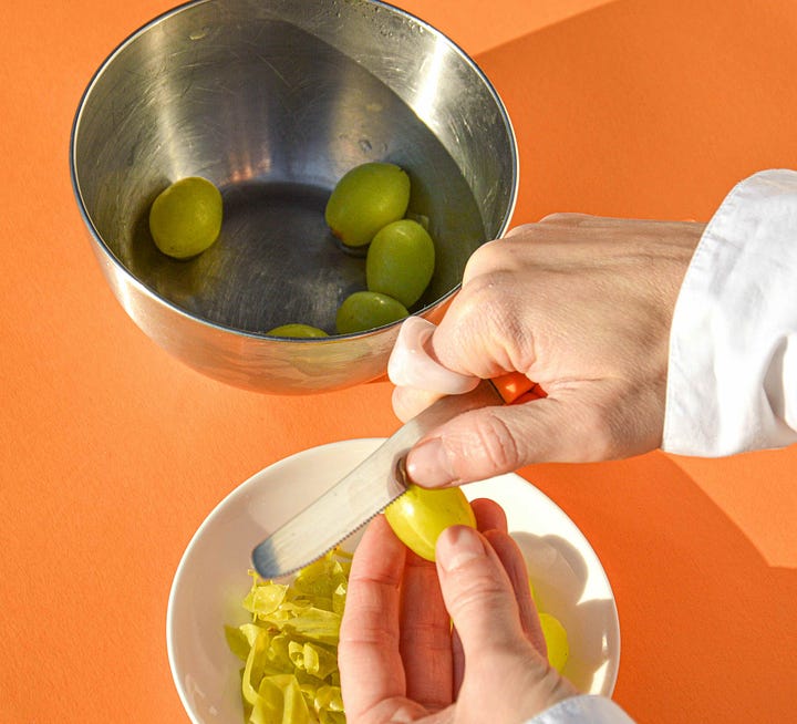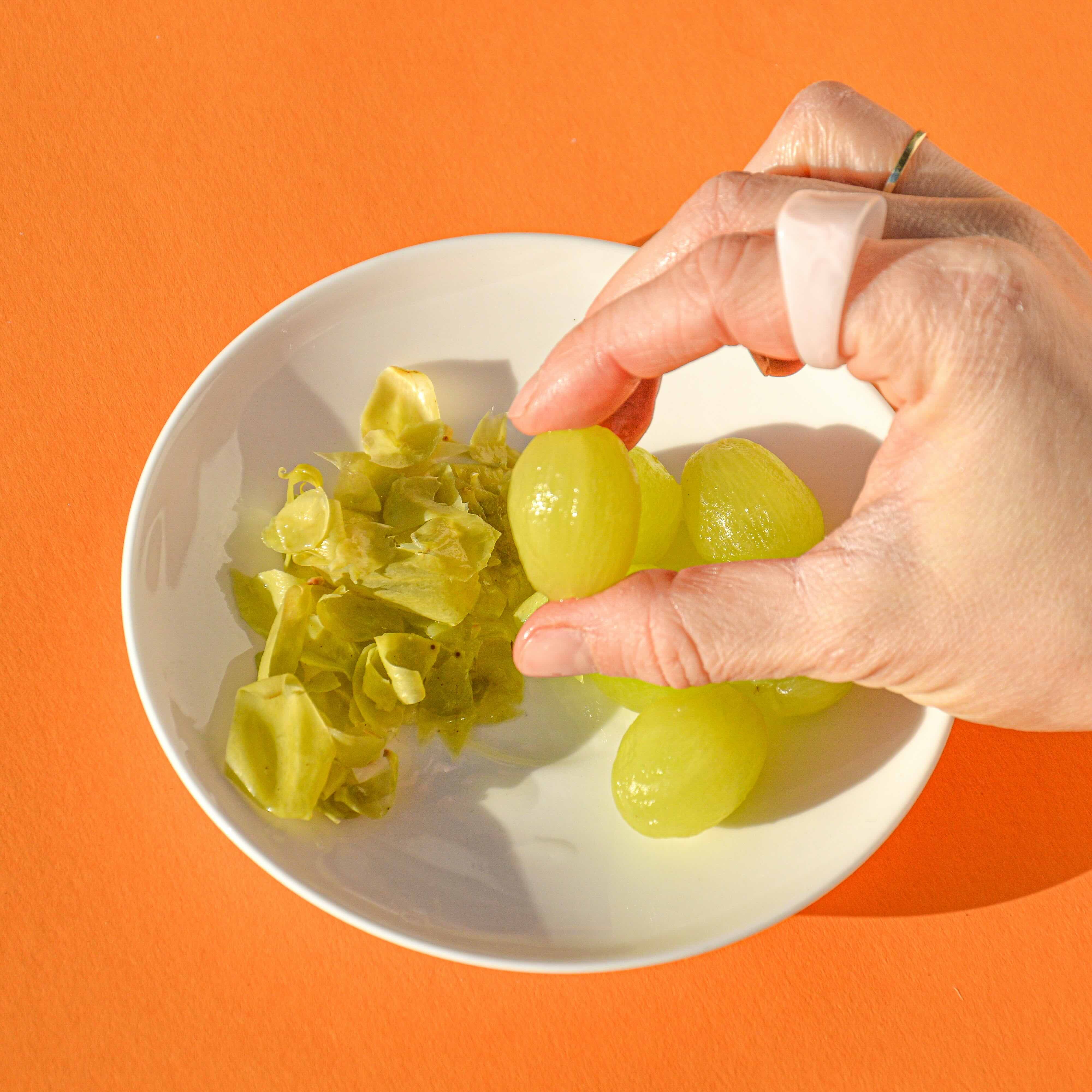 Once blanched, shock the grapes in ice water to stop the cooking process. Peel off the skin starting from the ‘X’ incision.
