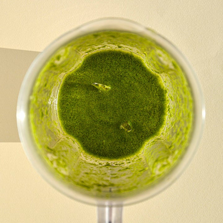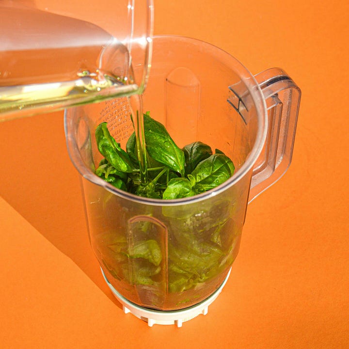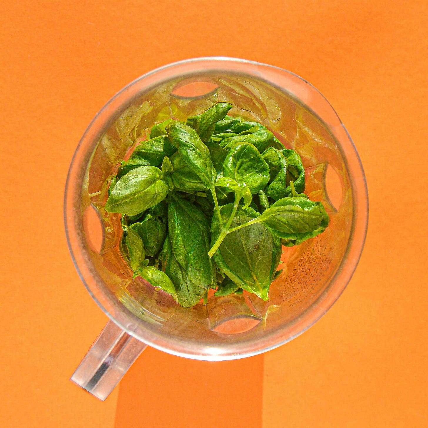 Add 150g of sunflower oil into the basil and pulse a couple of times until the basil is fully blended with the oil.