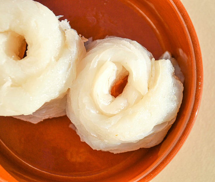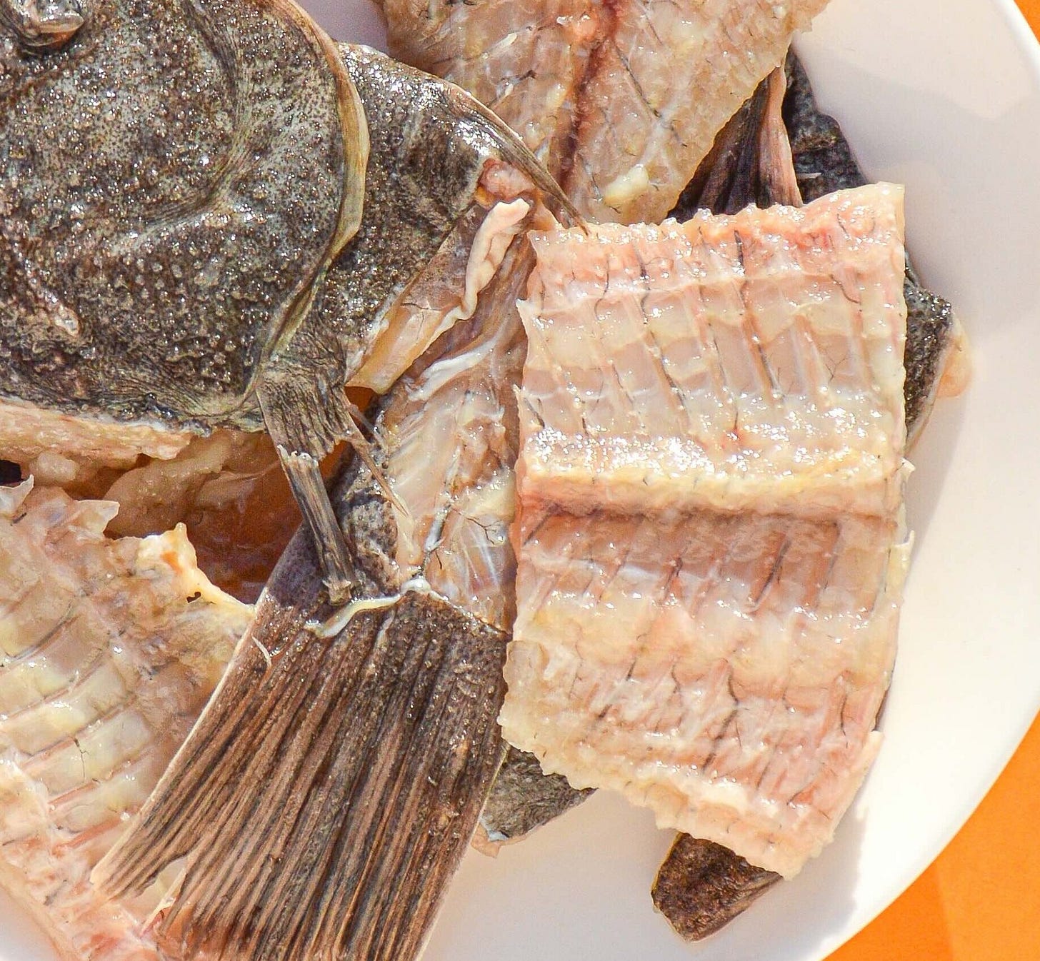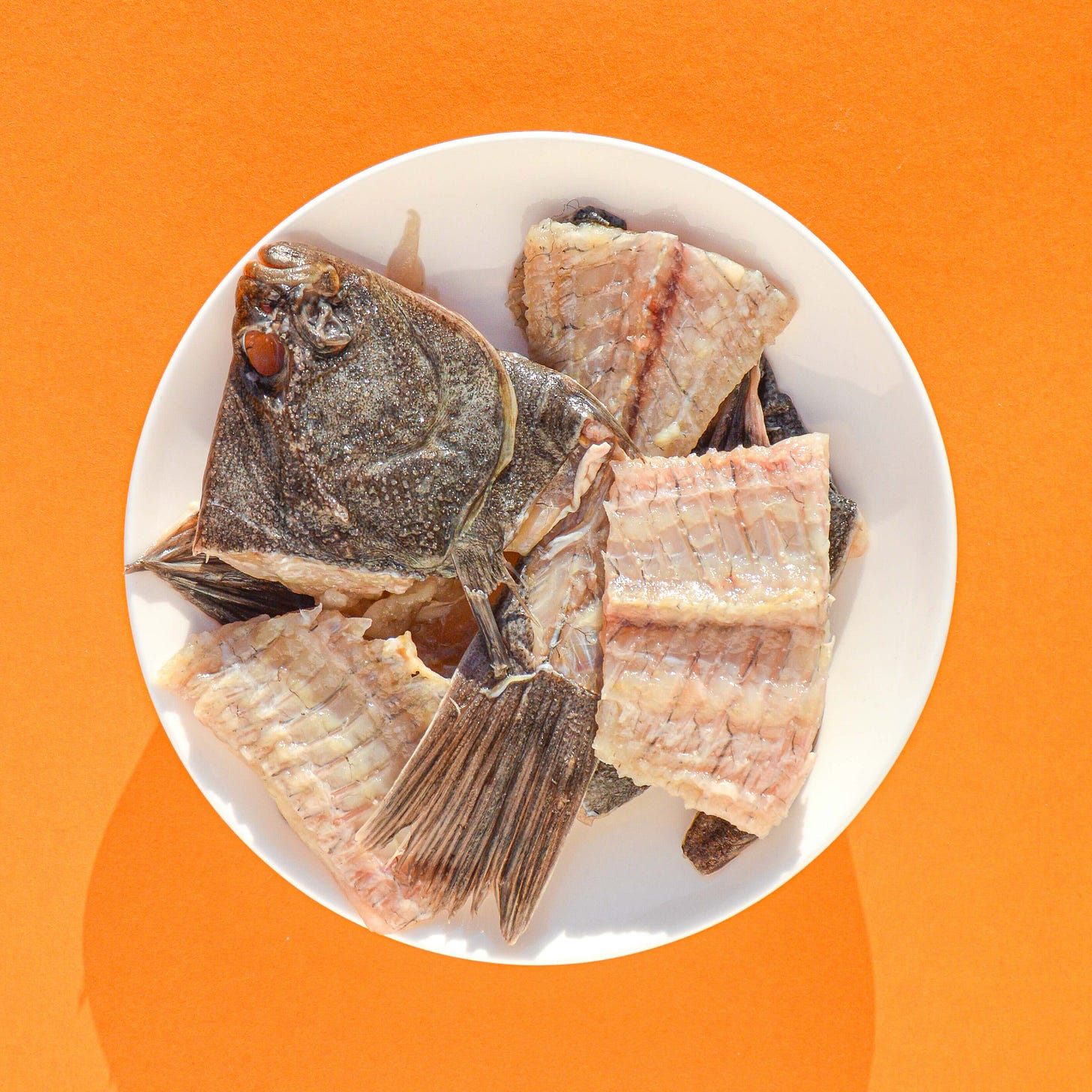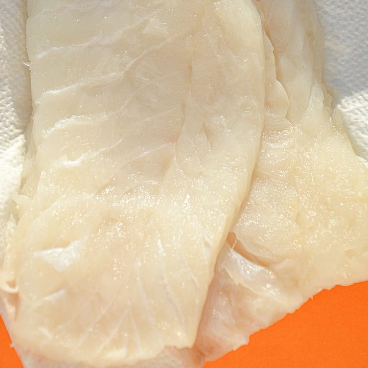 Separate the head from the spine, then take the spine and cut it into three pieces. This exposes more of the bone, making it easier to clean and remove any blood under cold running water. Rinse the spine thoroughly - this step is crucial for achieving a clear fumet.