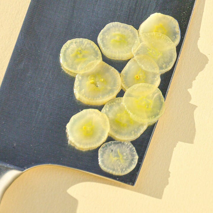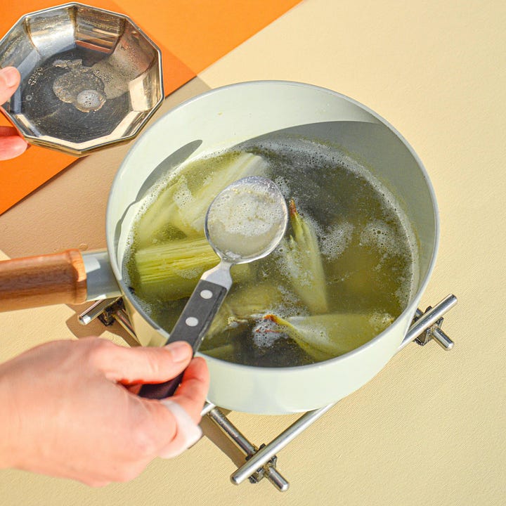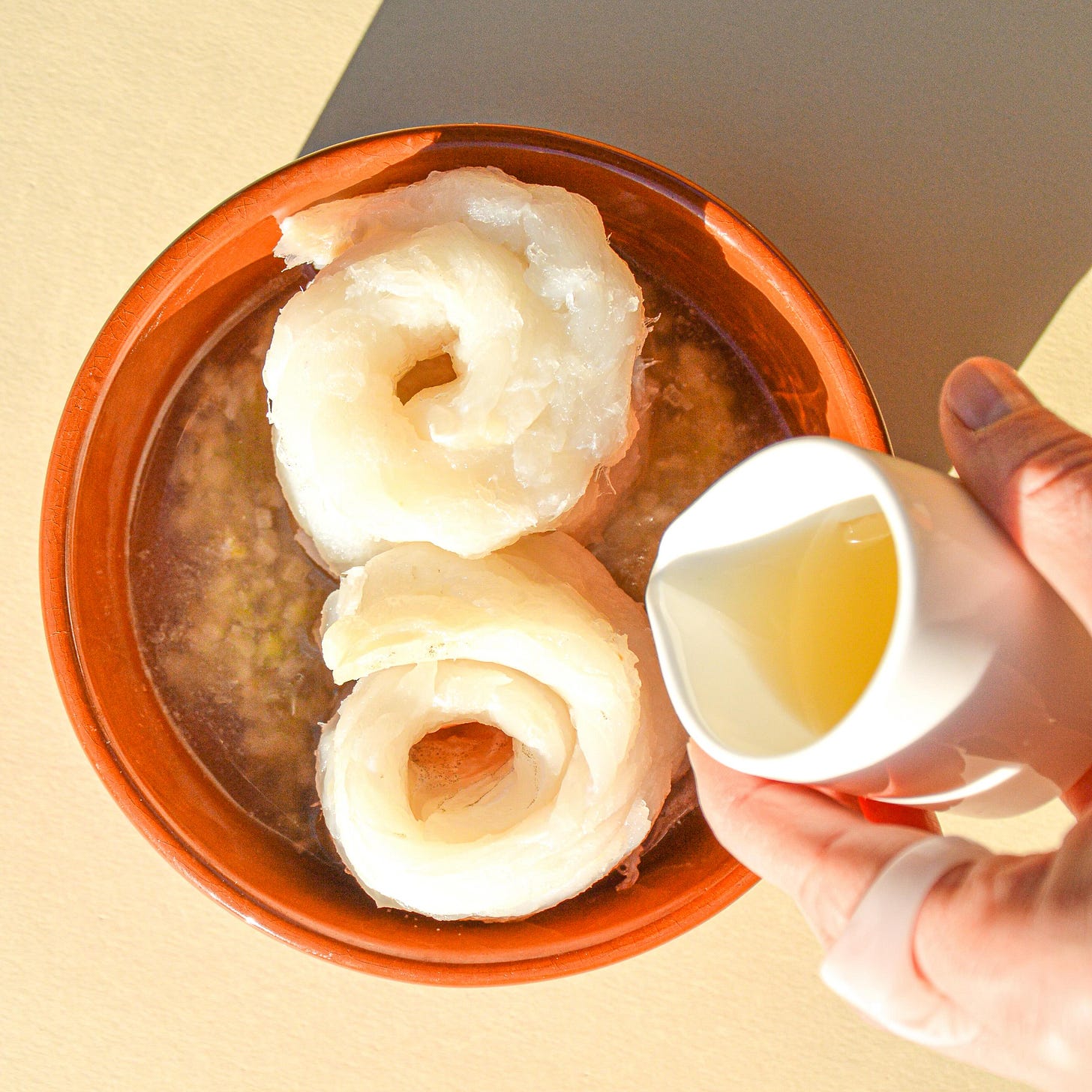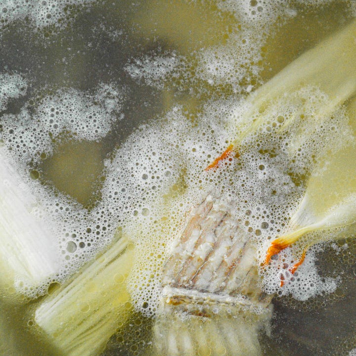 Once 20 minutes have passed, add a small drop of lemon juice and season lightly with sea salt (keep in mind that the fumet will serve as the base for the fish velouté, so we’ll re-season later). The stock should be clear and clean, as shown below.