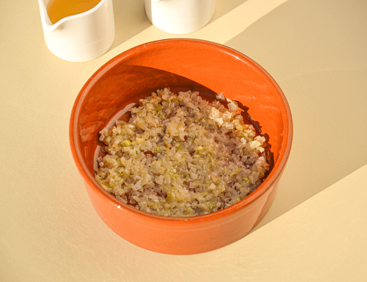 Add the brunoised shallots, 25g of dry white wine, the 25g of reserved fumet (or cold water), a squeeze of lemon, and season with salt.