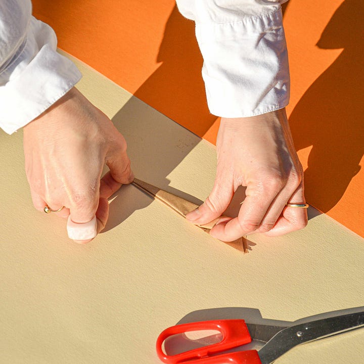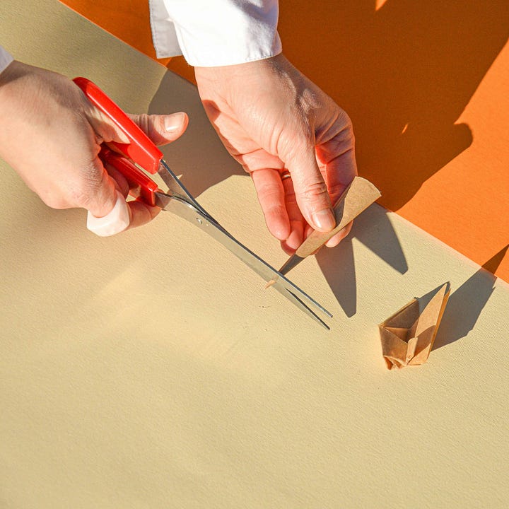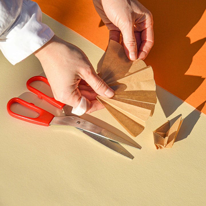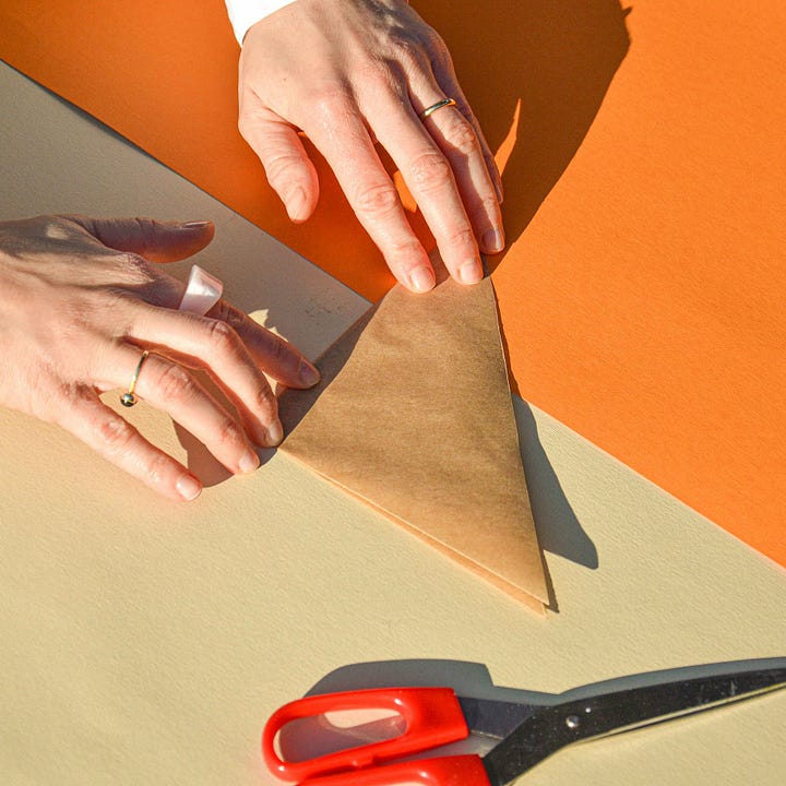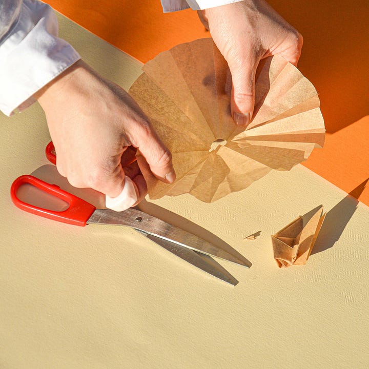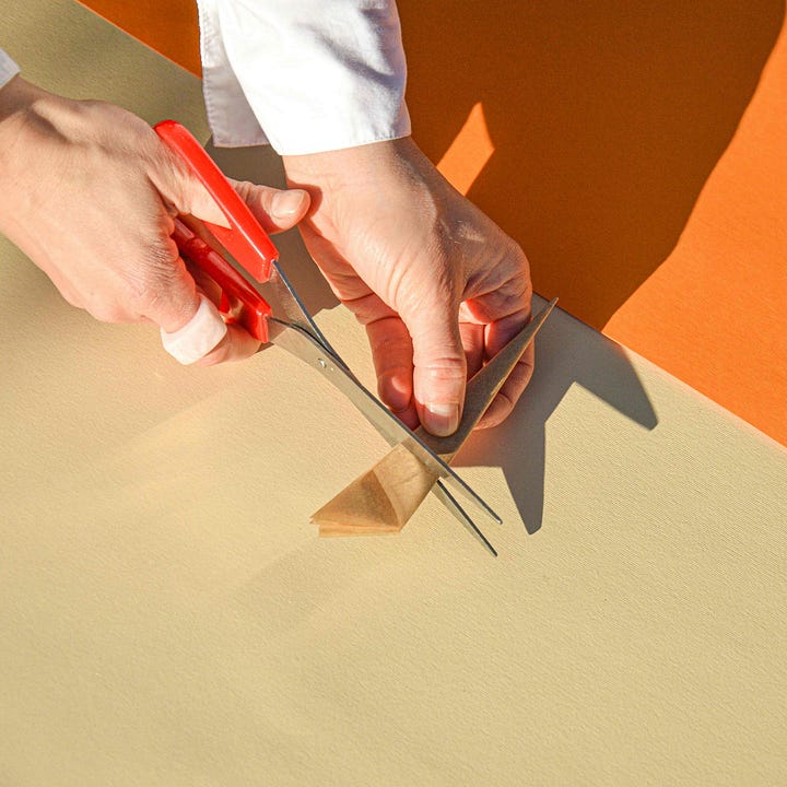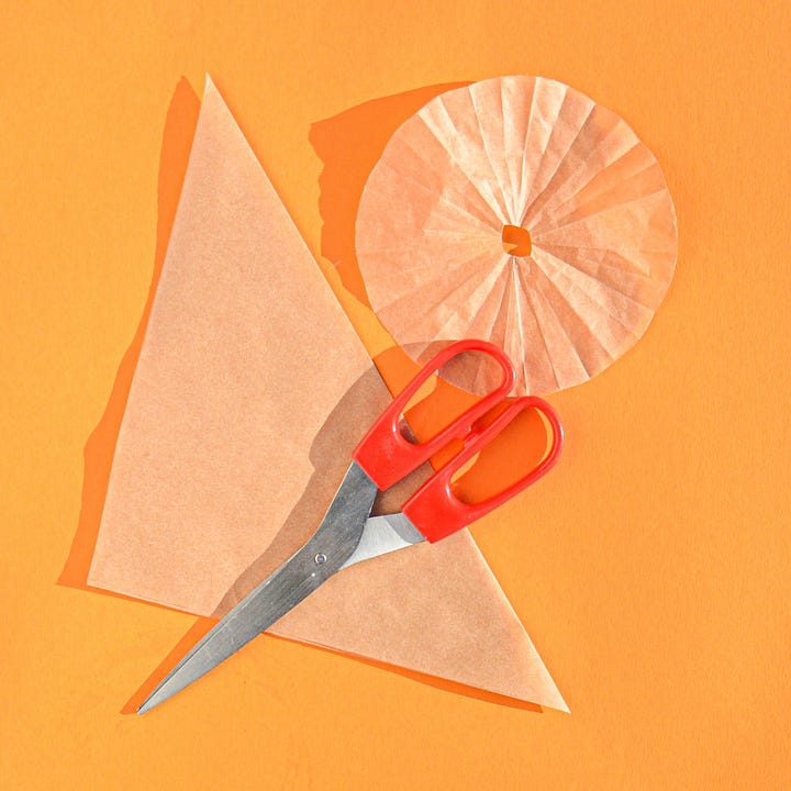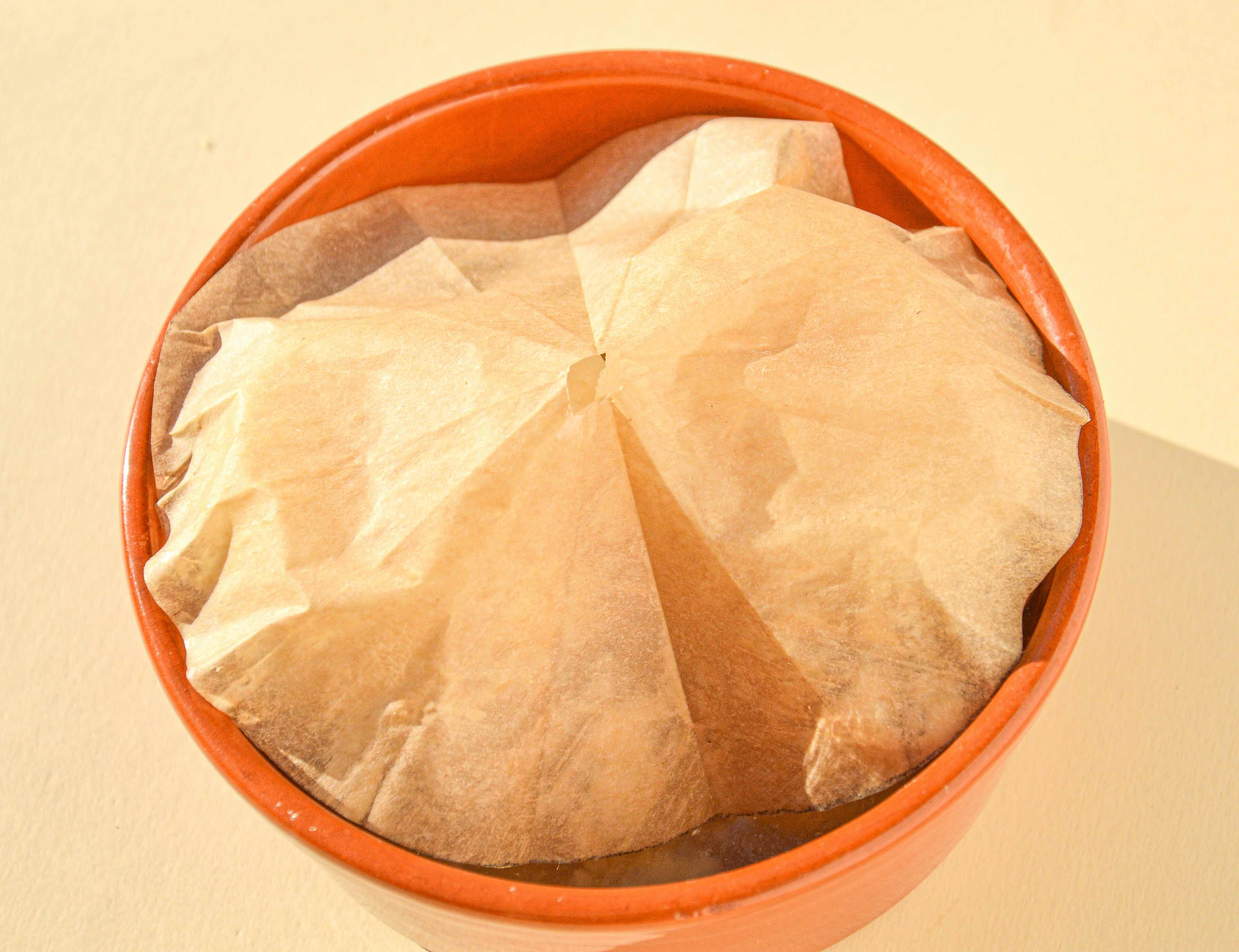 Hold the folded parchment and measure the radius of your poaching container. Cut the open edge into a half-circle. Make a small slit of about 2 mm at the tip to allow a little steam to escape during cooking. Unfold the paper to reveal your cartouche.