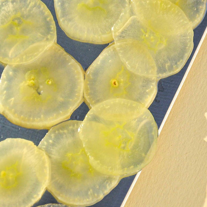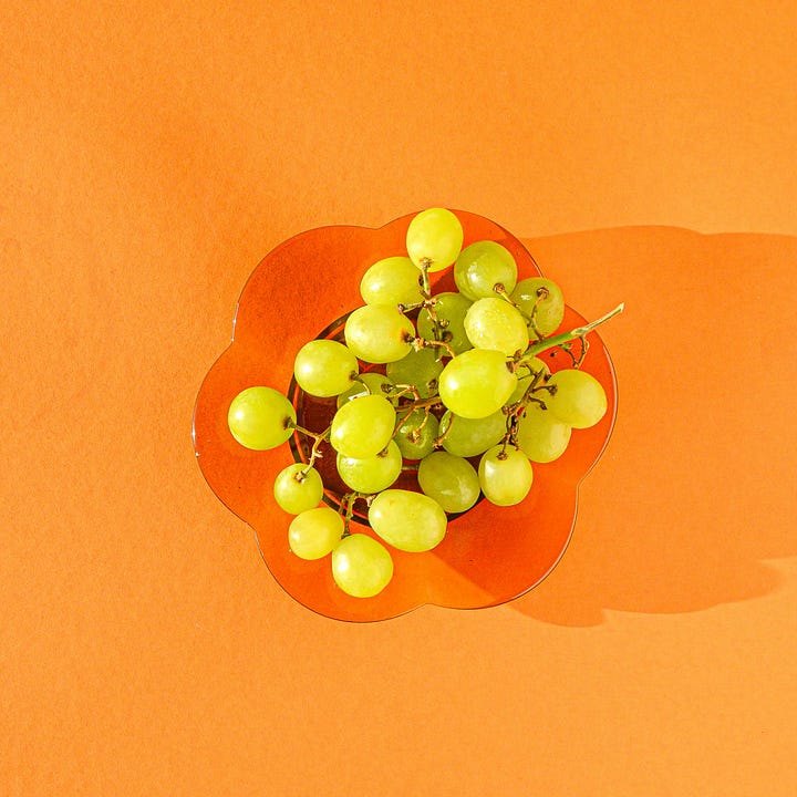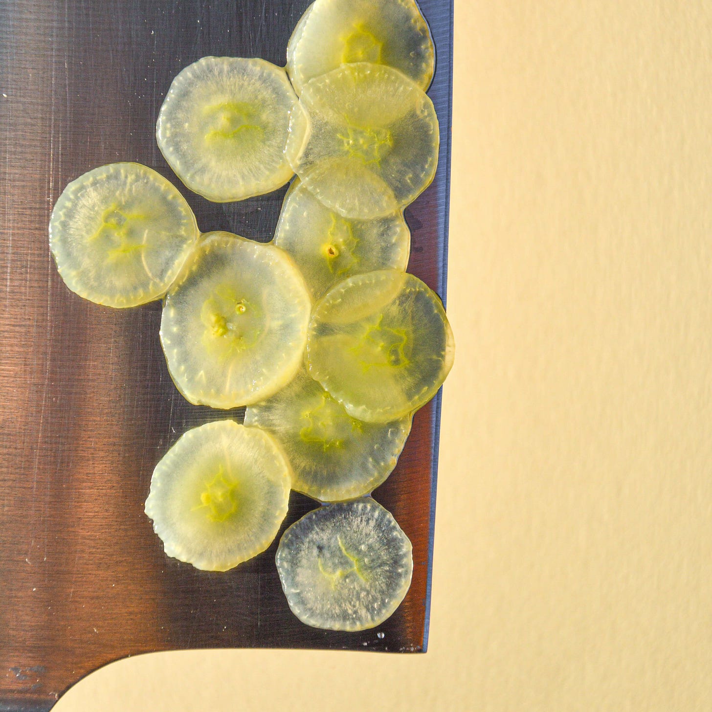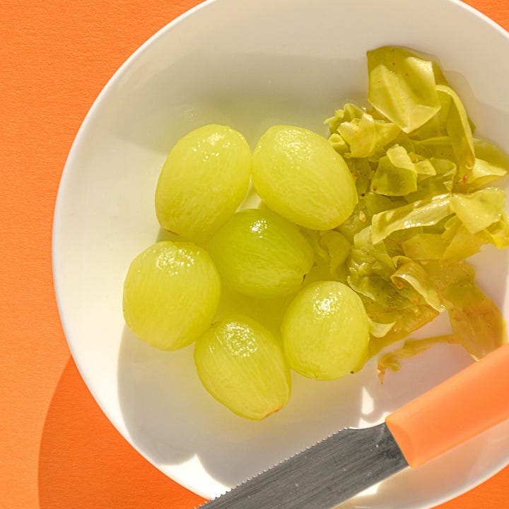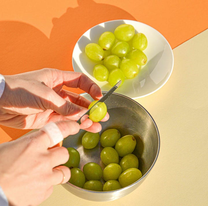 Cut most of the grapes in half, leaving a few whole to thinly slice as shown below.