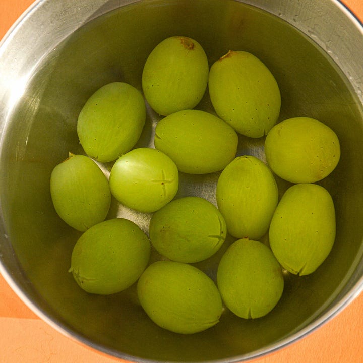 Blanch the grapes by pouring the hot water over them and letting them sit for about a minute, or until you see the skin begin to loosen.