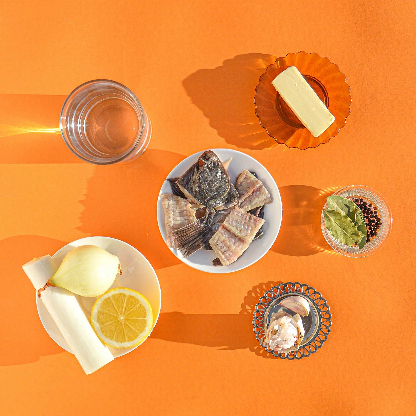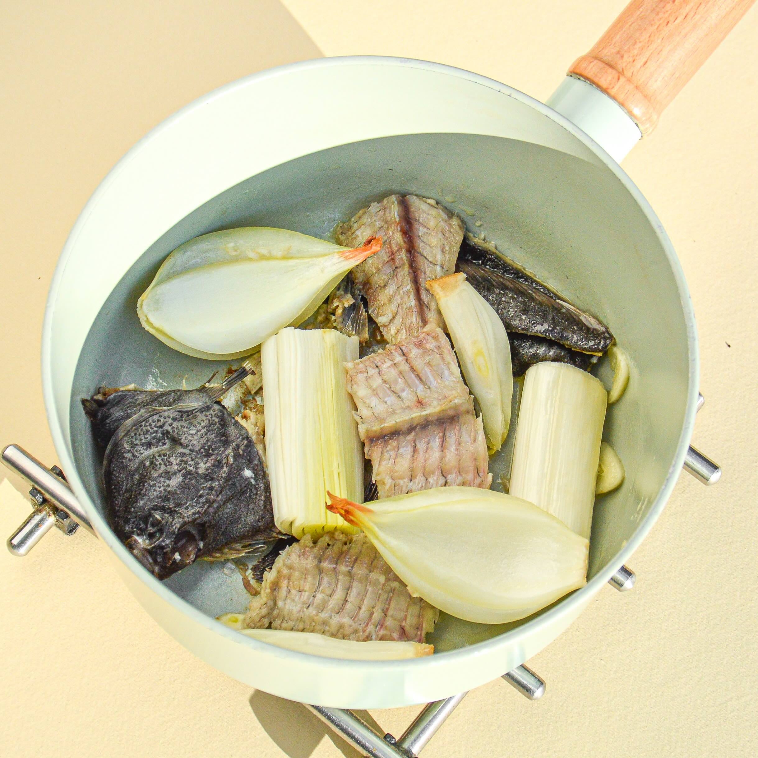 In a pot, heat the unsalted butter over medium-low heat. Place the bones and head in the pot and let them sweat for 2 minutes without colouring. Then stir in the onion, leek, and smashed garlic.