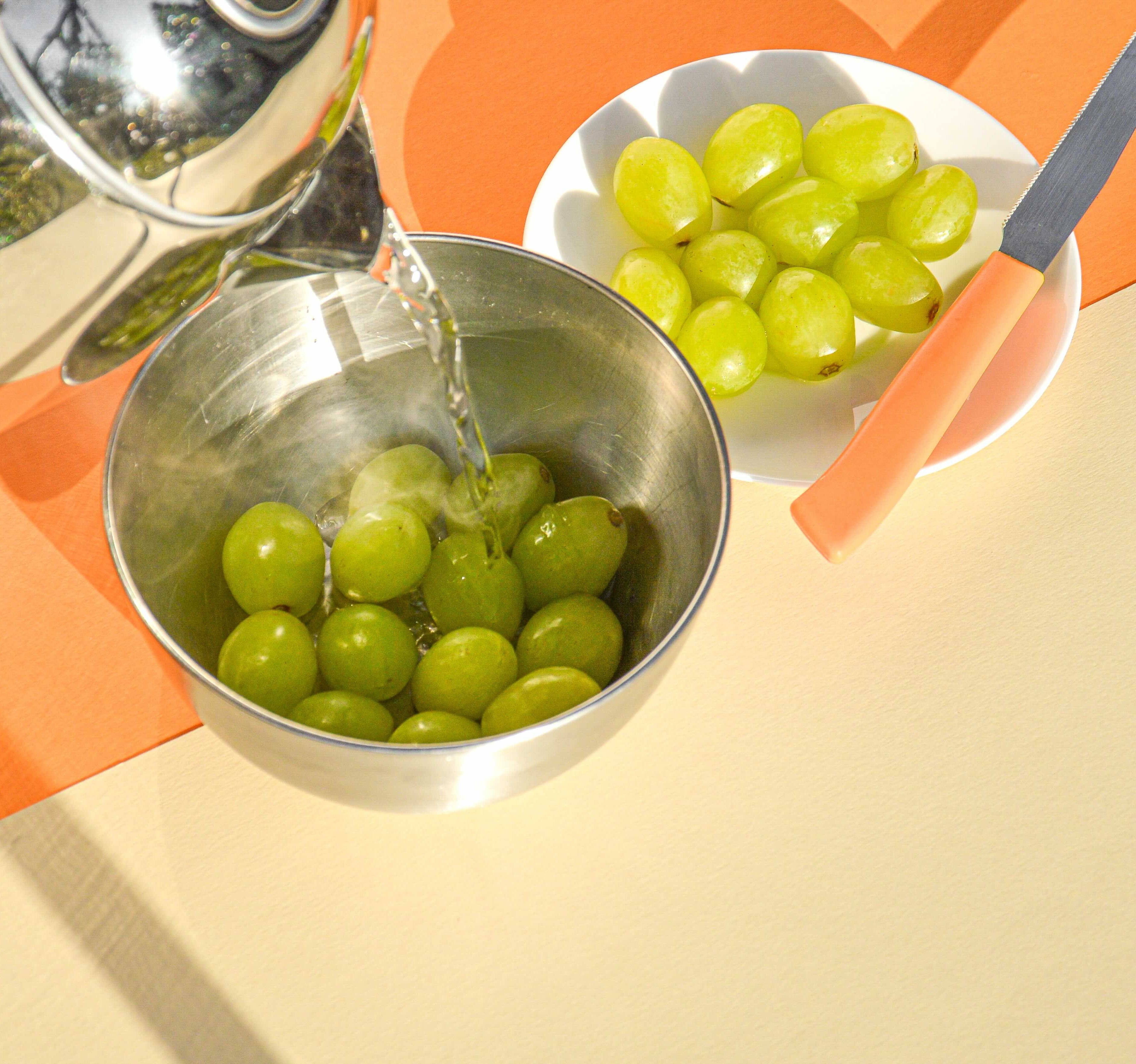 Using a sharp knife, make a small ‘X’ shape at the top of each grape. This will help the skin loosen when you blanch them. Place the grapes in a heatproof bowl.